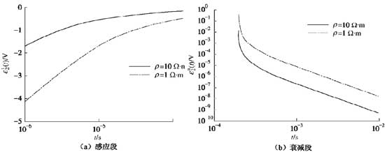 由式(12a),(12b)可获得电流线性关断条件下全程二次感应电动势ε2(t)。图2给出了ρ分别为10Ω.m和1Ω.m的感应电动势曲线,从中可见,感应电动势在感应段εi1(t)和衰减段εa2(t)极性相反,感应段的响应值比衰减段大,且电阻率越低,其响应幅值越大。