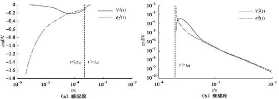 图3给出了ρ为10Ω.m情况下。ε2(t)经接收系统的输出曲线V2(t)。可见,εi2(t)不仅存在与感应段,而且且因接收系统的过渡过程影响,信号延仲至衰减段;εa2(t)同样因受接收系统过渡过程影响,前期部分信号与理论信号存在明显差异,本次算例中,约至延时1ms以后,理论与实测信号一致。