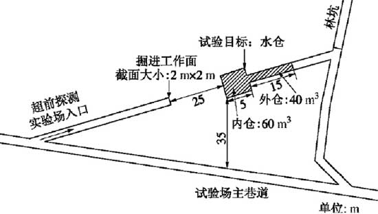 试验坑道顶标高175m,截面宽2m,高2m,两帮为泥岩,较平整,顶、底板分别为砂岩和粉砂岩,属于二叠系下统童子岩组地层,海陆交互相含煤沉积。如图5所示,在试验掘进坑道前方25m处布置水仓模型,分内外两仓,内仓为长方体,截面为正方形,边长为5m,储水60m³;外仓截面为长方形,宽1.2m,长15m,储水40m³,内外两仓共储水100m³;水仓整体沿坑道走向布置,走向长度20m,分布在坑道前方25~45m之间。