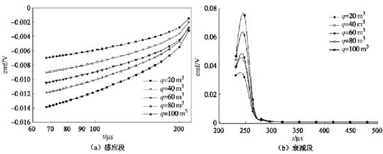 图6为水仓内不同水量情况下的实测感应电动势剖面,图中横坐标q代表水仓内的水量。由于在观测过程中,装置回线及观测参数等均不变,唯一改变的是水仓内的水量,因此,可以认为感应电动势发生变化是由水量改变而引起。从图6中横向变化可见,随着水量的增加,前期测道感应电动势逐渐下降,尾部测道感应电动势有逐渐上升趋势,表明瞬变场响应因水仓内水量变化而发生改变,进一步说明水受回线源激励影响,产生了瞬变场信号。