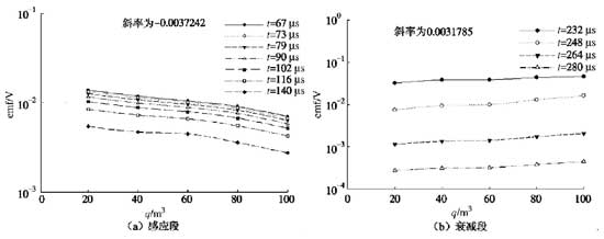 图9给出了不同时间窗口的水体异常感应电动势与水量变化的关系曲线。在感应段,由于水的异常电动势为负值,为方便获得该段异常电动势与水量的相关关系,将异常电动势取绝对值,获得图9(a)。从该图中明显可见,在整个感应段,坑道前方水仓内水量与其异常电动势在图中所示的单对数坐标系下近似呈线性变化关系,斜率约为一0.0037242,由此说明,在感应段,随水量递增,水的异常电动势幅值在对数域近似呈负向线性增长;图9(b)反映了衰减段水量与异常电动势的变化关系,与感应段相似,两者在单对数坐标系下也近似呈线性变化,斜率约为0.0031785,表明了在衰减段,随水量递增,其异常电动势幅值在对数域近似呈线性增加。总而言之,水量递增,其异常电动势响应越大,且其响应值在对数域内近似呈线性上升,但感应段和衰减段异常幅值的上升速度不同。