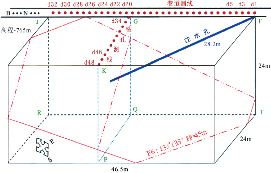 试验利用﹣675巷道作为巷道测线,巷道测线(FJ)长46.5m,布置32个电极,电极距1.5m,电极编号依次为d1~d32;在巷道侧帮,离F点28m布置一个与巷道垂直的水平钻孔,钻孔方位158°,在水平钻孔内布置16个电极,电极距1.5m,电极编号依次为d33~d48,钻孔测线(GK)长24m,钻孔测线采用全孔注浆耦合方式进行电极安装;N极置于﹣675巷道侧帮上,距离d32电极20m;B极置于﹣675巷道底板上,距离d32电极400m,如图2所示。巷道中揭露F6断层在d25与d27之间;注水钻孔孔口位于d1电极附近的F点位置,注水孔全长28.2m、方位角198°、俯角21.6°,注水孔穿过断层界面2m,终孔位于断层下盘三灰中,注水孔沿孔口下套管24m,钻孔穿断层面,在上下两盘各保留2m裸孔,确保注水进入断层。