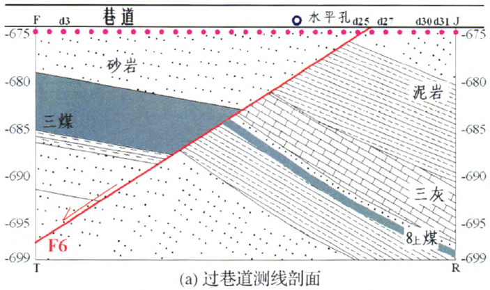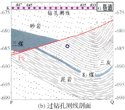 F6正断层上盘属于下二叠系山西组地层,由砂岩、粉砂岩、泥岩、煤层组成。F6断层下盘属于石炭系太原组地层,主要由粉砂岩、泥岩、灰岩及煤层组成。岩层分层结构清晰,组成一个小向斜,如图1所示。