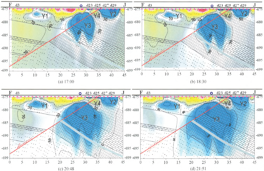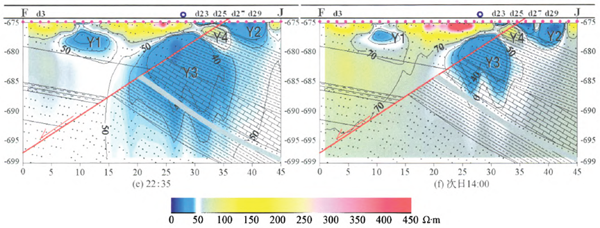 实时电阻率切片反应岩体中断层对水体扩散的控制作用,并能跟踪水体渗流方向,结合岩层特征分析,可以进一步分析不同岩层和破碎带的渗流速度、储水量等参数。对于分析岩体渗流的动力学机理有明显效果。