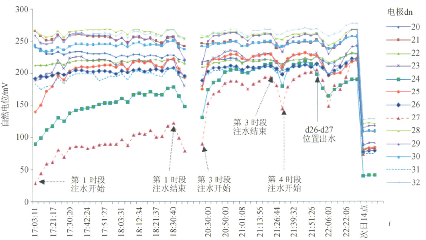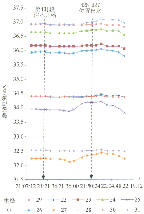 选取巷道d20~d32电极不同时刻自然电位分析,如图5所示。试验第l时段17:03注水至18:30结束。自然电位逐渐上升;试验第2时段停止注水,自然电位下减;试验第3时段注水,自然电位又出现上升,21:26停止注水,自然电位再次下降;试验第4时段,随着注水量的增加自然电位增加到极值点(21:52巷道出水)。试验第5、6阶段停止注水后,自然电位下降并与次日稳定至最小值。自然电位的高低变化与水流的升降一一对应。而且发现不同电极所对应的自然电位的升高幅度也有明显区别,从图5中可以直观地发现,d27自然电位相对波动范围最大,达到100mV,d24的波动范围为70mV,其他电极波动范围显著减小。对比实际巷道出水位置为d27、d26电极位置,按照渗流电场原理可以解释d27为出水点,与实际情况相符。因此自然电位的相对升降与其幅度的大小反应了,岩体水体渗流的变化过程,并指示出水点的位置。3.3岩体渗流过程激励电流特征分析