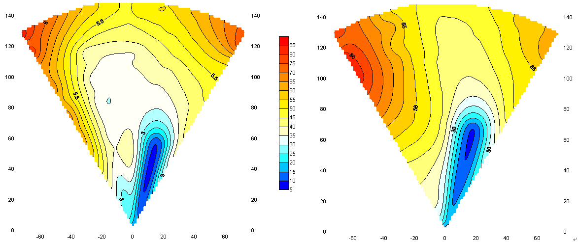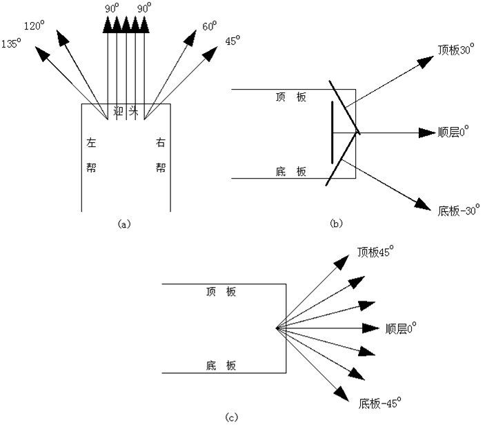 上述问题可以通过以下方法解决,方法一:通过观测系统来减少外界干扰因素的影响,由于巷道支护在没有构造的情况下基本一致,这种情况则需要数据采集时尽量减少支护等对数据的影响;在现场探测时,测线布置可以选择不在左右帮采集的数据,而是把原有的从180°、165°、150°、135°、120°、105°、90°、75°、60°、45°、30°、15°、0°的测线转化为135°、120°、105°、90°、90°、90°、90°、90°、75°、60°、45°的测线,同时在探测时把原有的45°、0°、-45°探测角度转为30°、0°、-30°角度,纵向上原有的90°、75°、60°、45°、30°、15°、0°、-15°、-30°、-45°、-60°、-75°、-90°测线转换为45°、30°、15°、0°、-15°、-30°、-45°的测线,同时保持掘进与探测同步,掘进80m探测一次。这样可以减少左右帮及其顶底板金属支护的影响,同时此观测系统可以达到超前探的效果。此观测系统多次探测的连续数据,通过软件处理可达到掘进巷道全空间跟踪探测的效果,同时可以有效的解决由于金属等因素引起的有时前后数据在处理时深度系数、视电阻率系数存在很大差异、不易总结区域参数及目标体异常响应阻值范围的问题。此观测系统的示意图如图1a、1b。