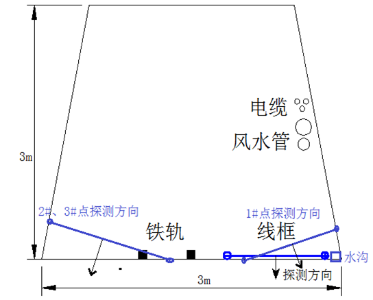 现场探测条件:本次探测在2水平进行,现场探测时,巷道右帮靠顶板位置有电缆,右帮腰线位置有风管、水管,右帮底板有水沟,底板靠巷道左帮位置有铁轨,见2水平巷道断面图如图3-1,探测条件如下表3-1所示: