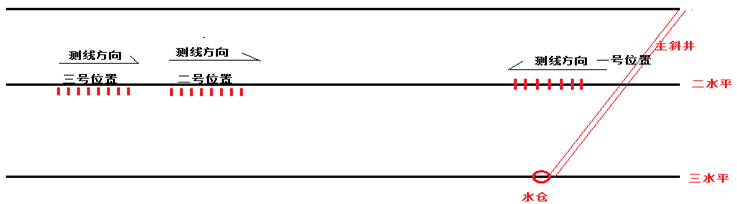 1 概况新化煤炭局采用福州华虹YCS256、湖南飞翼YCS160、重庆煤科院YCS1024三款仪器在稠木煤矿进行对比试验,主要任务就是对2水平2#、3#点底板富水性、1#点下方水仓富水性进行探测分析,也是对三家公司的三款仪器适用性进行校验。于 2015年1月11日上午对2水平1#点水仓位置探测,2水平2#、3#点底板富水性探测,探测地点示意图如图1。