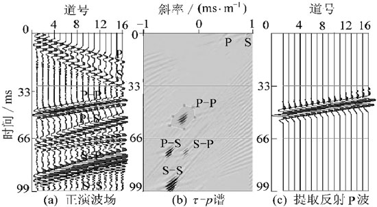 τ-p滤波是基于地震波在时间域上的视速度差异,对于有相对清晰的同相轴记录,就可以通过同相轴斜率p和时间截距τ的差异,进行波场分离与有效波场提取。从图1可以看出:线性τ-p变换对于波场信息保频保幅优势显著,特别对于直达波、后方及侧边的反射波能进行有效分离,突出巷道前方目的层的反射波具有明显作用。巷道地震信号,信噪比低,负视速度特征不明显,主要依赖τ-p滤波进行前方波场提取;在干扰严重的实际记录中,提取的负视速度纵、横波同相轴可能出现假象,这是实际应用中不能忽视的问题。