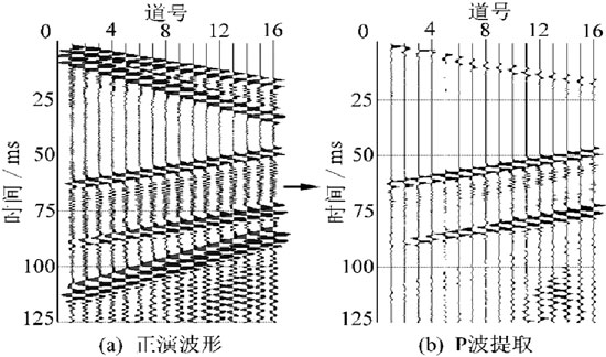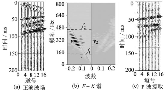 1)F-K滤波技术。F-K滤波波场分离是利用有效波、干扰波的频谱及视速度差异,进行波场分离的技术。具体表现为保留频带f1-f2(频率滤波)、视速度V1-V2(视速度滤波)的有效波,压制其他的干扰波。图2为采用与图1相同的正演信号图2a,经F-K变换得到图2b,滤波提取纵波的波形记录图2c。