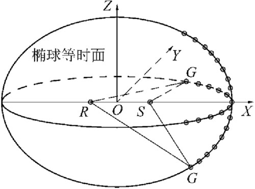 式(1)表示以激发点S(xS,yS,zS)及接收点R(xR,yR,zR)作为焦点的椭球面,故三维椭球绕射偏移定义了激发信号经反射点G返回接收点遵循椭球轨迹关系,如图4所示。