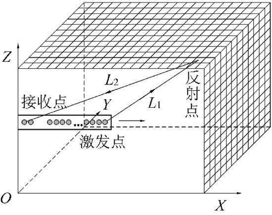 极化偏移原理如图5所示,在巷道超前探测过程中,井下全空间X方向指向掘进工作面,Y方向指向巷道左帮,Z方向指向巷道顶板;首先对巷道前方空间进行网格划分,黑色点为空间网格中假设的某反射点;掘进工作面后方同侧布置若干激发点及2个接收点(均为三分量接收)。假设传播时间用t表示,传播路径如图5中方向射线所示;在空间坐标系下,入射路径为L1,传播时间为t1;反射路径为L2,传播时间为t2;其中L1及L2射线路径在均匀空间可由激发点、反射点、接收点之间空间坐标求取,在非均匀空间可由射线追踪拟合曲线计算。