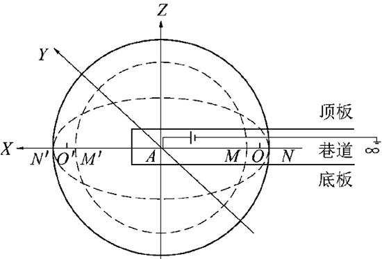 在均匀介质中,用测量极距MN对任意一点O进行探测时,实际上是探测以A点为球心,AO为半径,厚度为MN的球壳体积的介质电阻率。根据球对称原理,在MON处探测,等同于探测对称供电点前方的M'O'N'处结构体的电性变化。因此,采集巷道后方多个供电测量对电位值,经过数据校正,依据测深电阻率进行几何交汇,可以确定低电阻率位置,为超前探放水提供靶区。