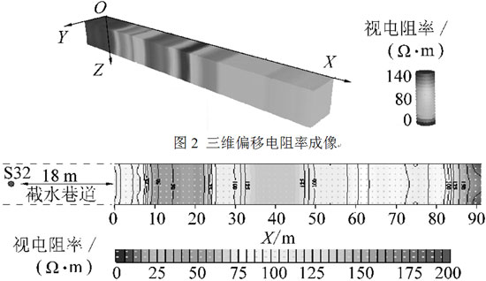 在前人研究基础上,经过对测试装置、仪器设备、数据处理方法等进行改进,构建巷道掘进地质条件数值和物理模型进行试验研究,并对掘进工作面进行连续跟踪探测与分析,取得了一些新的认识[30-33]。例如在测试装置中结合巷道特点,提出巷道有限空间内立体电阻率数据采集系统,可以利用任意供电测量对观测;设计井下巷道煤岩壁快速耦合电极,采用并行电法仪器进行数据采集,能够提高数据采集质量及效率;通过巷道空腔、测量电极异常、层状空间等影响因素校正处理,实现三维空间偏移成像、电阻率比值处理等,能够获得前方地质条件高分辨成像结果。图2为三维偏移电阻率结果图像,图,3为淮南某矿实际探测电性剖面,其中10~20处的相对低电阻率区,实际揭露时出现顶板严重淋水现象。