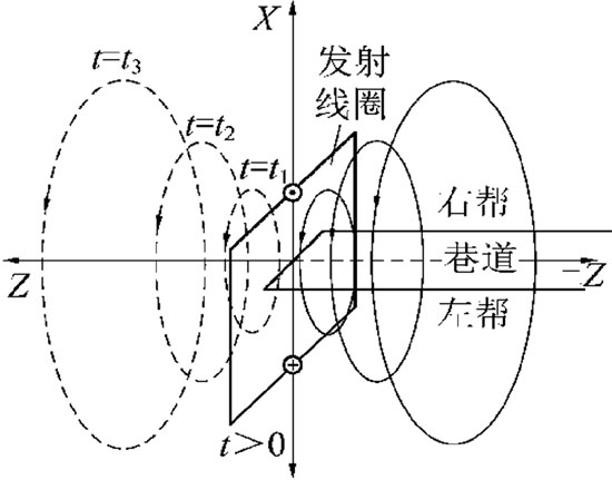 瞬变电磁法是通过在发送回线上供一个电流脉冲方波,在方波后沿下降的瞬间,产生一个向回线法线方向传播的一次磁场;在一次磁场激励下,探查介质将产生涡流,其大小取决于前方介质的导电程度;在一次场消失后,该涡流有一个过渡的衰减过程。该过程又产生一个衰减的二次磁场向掘进工作面传播,由接收回线接收二次磁场,该二次磁场的变化将反映前方介质的电性特征(图4)。如按不同的延迟时间测量和记录二次感应电动势V,得到二次磁场随时间衰减的特性曲线。前方无良导体时,曲线衰减较快,前方存在良导体时,所观测到的过渡过程衰变速度将变慢,据此进行电阻率计算,可以探测巷道前方的低电阻体。