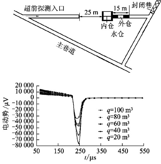 推导全空间条件下全程视电阻率计算方法,并通过对扇形观测条件下,不同角度测点在巷道前方形成的烟圈交汇特征分析,完成视电阻率扩散叠加处理方法[34-39]。同时,在淮南、淮北矿区完成多条煤巷、岩巷跟踪探测,对煤岩层含水特征电阻率判断进行总结。图5为构建的陷落柱模型及其正演模拟结果。图6为井下水仓测试的感应电动势变化曲线.可以看出,近距离含水体的瞬变场起始响应时间非常早且响应弱,实际探测时互感等已严重影响浅部弱含水体的分辨能力。随着水仓内水量q的减小,响应幅值速降,表明水量对瞬变场响应幅值具有决定的作用。