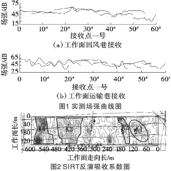由图1可以看出,工作面回风巷5#~15#区段为明显场强低值区段,其场强值多小于45dB,该段煤岩层对无线电波的吸收性强,可能为采面内夹矸厚度变化所致;工作面回风巷35#~45#点、工作面运输巷38#~45#区段为相对低场强区段,场强值多在45dB以下,该段煤岩层对无线电波的吸收性强,可能为煤层厚度变化所致;回风顺槽55#~58#点、工作面运输巷55#~59#区段为相对低场强区段,其场强值多在45dB以下,该段煤岩层对无线电波的吸收性强,可能为断裂构造发育或煤层变化所致。
