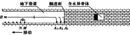 超前探测采用点源三极装置进行井下数据采集,一般在掘进面附近以一定间距布置供电电极A1、A2、A3,供电电极B置于无穷远处。测量电极M,N在巷道内按箭头所示方向以一定的间隔移动(图1),每移动一次测量电极,测量一次A1、A2、A3所对应的视电阻率值P1、P2、P3。