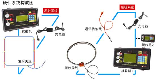 YDT88型无线电波透视仪是由福州华虹智能科技股份有限公司联合相关高校院所,引进先进的数字通信调制、高速采样、嵌入式系统等技术开发完成的新一代无线电波透视仪。该仪器具有轻便灵活、智能高效、透视距大、抗干扰能力强、续航时间长等特点。同时基于本仪器所形成的“一发双收”“一发一收”等现场工作方法,极大提高现场施工效率和探查精度。YDT88无线电波透视仪硬件系统构成图如图2-1所示。