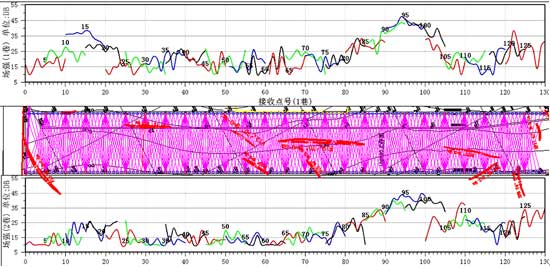 本次探测仪器工作稳定,接收数据较稳定,接收数据较完整。对受工作面金属体设备干扰严重的数据进行了剔除处理。