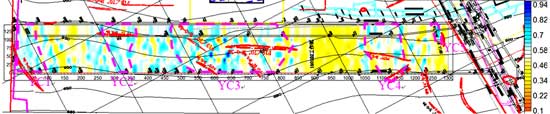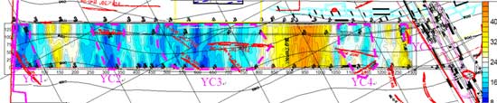 本次矿用无线电波透视仪SIRT反演吸收系数(CT)成像图,见下图4-4,该图中吸收系数的强弱表明煤岩层介质的差异,图中蓝色色标表示强吸收系数值,其蓝色越深表示存在异常的可能性越大,因此可以对内部构造及其特征进行判定。