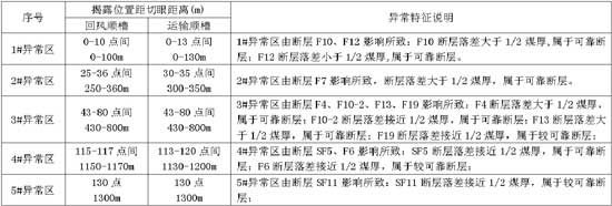 据实测场强值分布图综合分析,本工作面主要有6个探测异常区,各个异常区探测结果见下表所示。