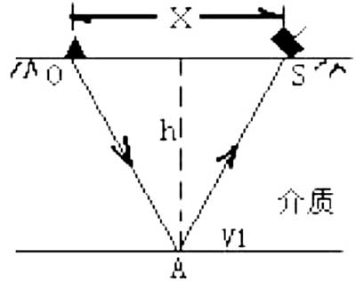 (1)单点探测原理。单点探测技术是源于反射地震波勘探中的自激自收方式,通过接收岩、煤层界面的地震波垂直反射信号,来解析计算目的层距离或厚度。由反射波时距曲线方程:4h2+x2=v2t2,令x=0,则h=vt/2。式中时间t和波速v取值准确与否,直接影响到目的层距离或厚度探测的精度(如图1)。
