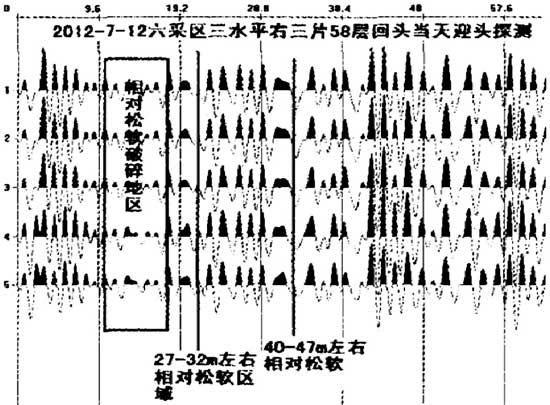 (1)案例一:探测位置位于六采区三水平右三片58层回头巷道内拐点前方15m左右,此巷是为采煤工作面下巷巷道,是过断层后的穿岩巷道,探测位置位于断层下盘内,迎头为砂岩,岩性相对破碎,为了解并寻找58层煤的位置,特进行了本次的物探(58层煤厚一般在0.8~1m左右,倾角一般在20~35°之间)。