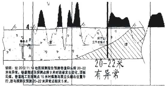 3.3 案例三:经新兴矿对五采区三水平右二片66层石门探测位置前方进行掘进验证。巷道掘进至探测点前9米时岩层倾角变大,底板见煤。巷道施工至探测点前15m时煤层与原迎头锤击位置平行,故与探测仪预测20~22m异常点相差5m。(验证情况如下图10)。