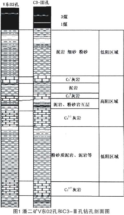 根据淮南矿区A组煤开采底板灰岩水文地质综合柱状图及测井资料,基本掌握了淮南矿区A组煤底板地质情况,图1是潘二矿V东02孔和C3一Ⅲ孔钻孔剖面图。分析可知,3煤和1煤底板下的C31灰岩和C32灰岩岩层厚度小,平均厚度1.5~1.8m左右,富水性相对较弱,而C33上。灰岩和C33下灰岩岩层厚度较大,平均厚度4.5~5.5m,是淮南矿区A组煤开采的直接充水含水层,存在突水隐患。