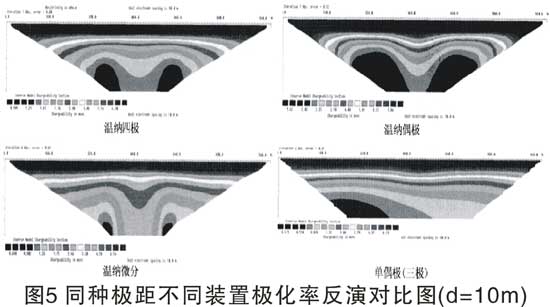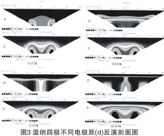 将装置类型(温纳三极、温纳四极、温纳偶极及温纳微分)和测线的电极距d当做因变量,得到不同装置类型分别在不同极距时的电阻率、极化率反演剖面图,如图3~5所示。通过分析得到以下结论。