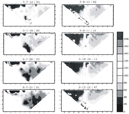 通过室内物理模拟实验,由图7可知,视电阻率剖面图对水的响应敏感度较好,从5-7-18:00开始注水到5-7-2l:30水槽注满水,随着水槽内水量的增加,物理模型左侧面的视电阻率值逐渐降低,当水槽注满时,视电阻率值最低;然后随着放水时间(5-8~5-9)的增加,视电阻率值逐渐升高。图8是视电阻率平均值与水量关系曲线图,由图可知,随着水量的增加,视电阻率平均值逐渐降低。极化率效果整体不是很明显,此次实验未达到理想效果,分析原因一是本身模型阻值较高,极化效果差;二是电极选取问题,本次实验并没采用一开始预想的硫酸铜溶液不极化电极,采用石墨棒代替,对极化效果存在一定影响。