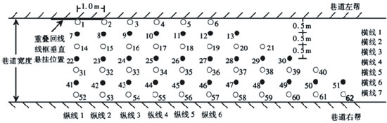 图2为测试巷道测点分布平面图,测试时将边长2.0m的重叠回线线框悬挂在巷道左帮岩石上,现场总共布置测点62个。根据巷道条件现场共布置横向测线(沿巷道走向方向)7条,横线间距0.5m;同时形成沿线框法线方向的纵向测线6条,纵线间距1.0m(见图2)。