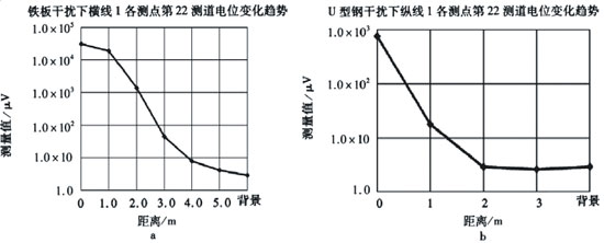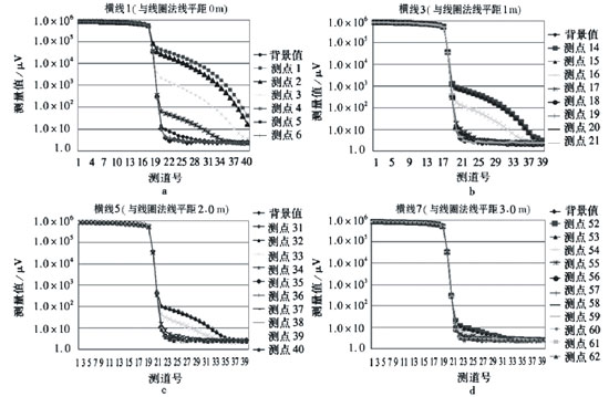 试验中铁板面积较大,与U型钢相比,两者的测试电压值相差100倍以上,表明金属物件的体积对测试结果影响程度差别明显。图7为各测线测点移动时其中的第22测道观测值的变化趋势,在线圈中心的法线方向和横侧向上,观测电位值随试验物件远离离开线圈,其响应值呈指数衰减,且在横向上其衰减的梯度明显大于法线方向,且有个拐点,出现在线圈内至线圈外的移动时,说明线圈正面框内金属干扰影响程度远较框外大。