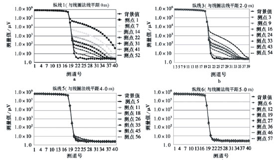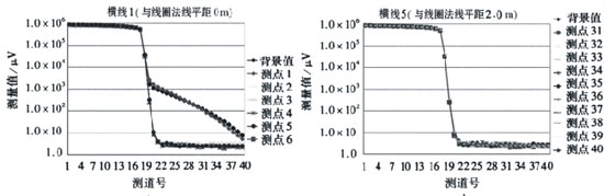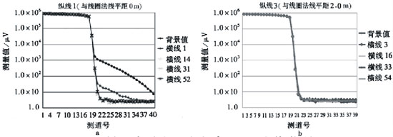 纵横向测试结果分析,干扰场响应在线圈横侧向上减小幅度较法线平面方向大,如横向测线从第5测点(即铁板边缘离线框边2.0m)开始试验物的瞬变电磁场的响应值已全部减弱至与背景值同一个数量级,影响基本消失。