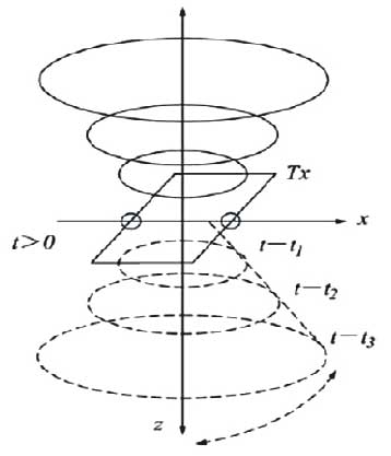 矿用瞬变电磁法在忽略隧道空间的影响下,可以理解为线圈被整个大地给“包”了起来,所以在线圈的两侧都会产生“烟圈效应”,其响应特征为全空间电磁响应,如图1所示。