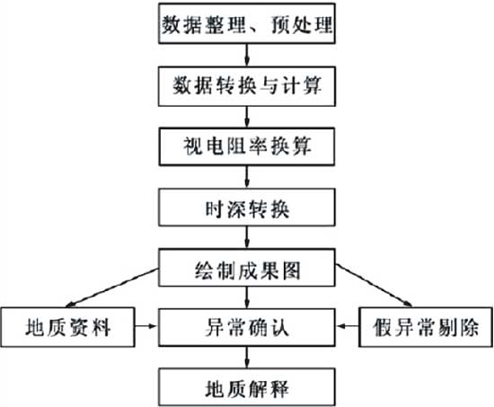 瞬变电磁法勘探资料的基本处理过程是:解释数据整理、数据预处理;数据转换与计算;视电阻率换算;时深转换;绘制成果图;异常确认;根据地质及水文资料进行综合解释。瞬变电磁法勘探资料的解释需结合已知的地质、钻探和水文等资料。在具体解释中还需做到:①人工解释与计算机解释相结合;②多测线解释相结合;③电性解释与综合地质分析相结合。