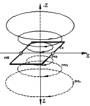 矿井瞬变电磁法原理与地面电磁法原理基本相同,所不同的是矿井瞬变电磁法是在井下巷道内进行瞬变电磁场呈全空间分布,接收线圈接收的信号是来自发射线圈上下两个方向全空间岩石电性的综合反映[7~10]。