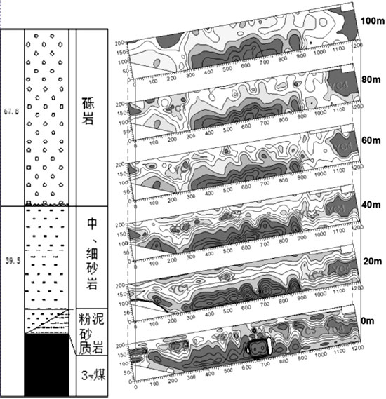 为了解影响3煤开采含水层的电性特征,把运输巷和轨道巷两巷的数据进行联合反演,制作了3煤上100m、3煤上80m、3煤上60m、3煤上40m、3煤上20m、3煤上0m切片图来了解3煤顶板砂岩含水层、侏罗系砾岩含水层的富水性。对于3煤顶板砂岩含水层富水区的划分:以3煤上20m~40m切片为准,重点考虑视电阻率小于10Ω.m的区域,视电阻率小于6Ω.m的区域定为强富水区。对于3煤顶板侏罗系砾岩含水层富水区的划分:以3煤上60m~80m切片为准,重点考虑视电阻率小于10Ω.m的区域,视电阻率小于6Ω.m的区域定为强富水区。