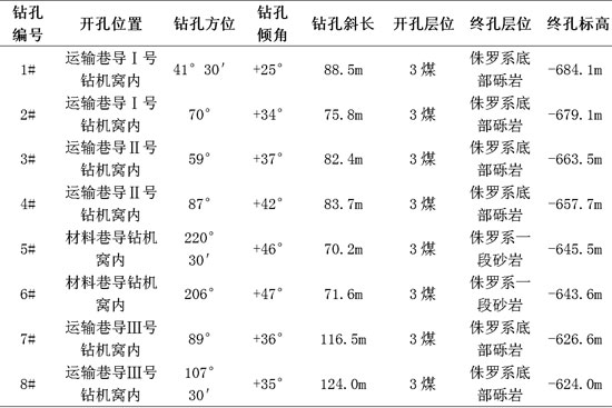 1、在轨道巷Ⅰ号钻机窝施工1#、2#钻孔,设计高度为穿透侏罗系底部砾岩,用来验证富水异常区YC1。