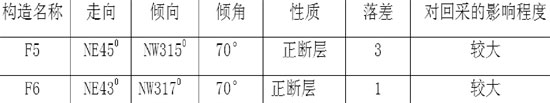 本区域依据地质报告及7#层和11#层开采资料显示断层稀少,根据掘进时的实际揭露情况,2103进风顺槽420米处揭露有1条落差3米的正断层,在5103回风顺槽侧未揭露,该断层经过观察不导水,在工作面切眼巷120米处(2103巷侧)发现一条落差1米的正断层,该断层在8103工作面两顺槽巷均为发现。这两条断层对工作面回采都有较大影响。本工作面裂隙较为发育,无火成岩侵入的岩墙和陷落柱,地质构造中等,两顺槽巷道为先下山后上山,成向斜构造,倾角0°~10°,2103巷最低处位于500米处,5103巷最低处位于550米处。区域内地表无小窑。本区可采煤层老顶均为粗、中、细砂岩,砂质泥岩。本区揭露断层如表1-2。