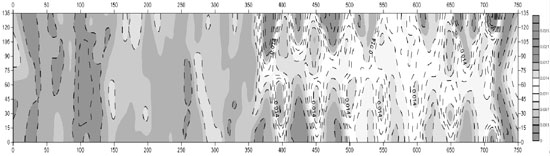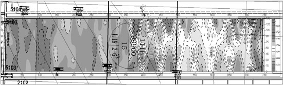 从本次探测工作可以看出无线电波透视对8103回采工作面的异常区域有较好的反映,为不漏掉异常,经过计算机数据处理(吸收系数在0.001~0.029),圈定1处较为集中的异常区,如图4所示,上部边界为8103工作面运输顺槽,下部边界为8103工作面回风顺槽。探测的异常区域主要是绿色以上(吸收系数大于0.014)的异常区域(部分结合实测曲线解释),异常可能是煤层变化区域或构造(陷落柱、断层等)密集发育区域。