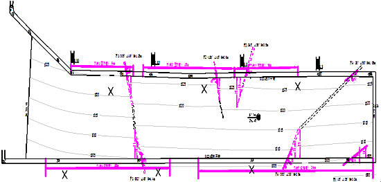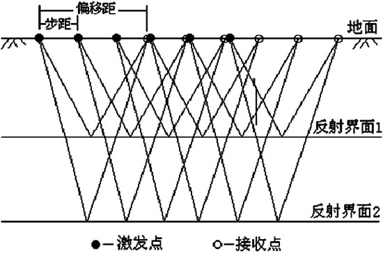 根据工作区井下地质条件,在保证能够采集较好质量数据及满足测深需要的同时布置物探测线,共布置了5物探测线。现场测线布置完毕后,采用矿井地质探测仪(KDZ1114-6A30-Z),进行反射共偏移方法探测。反射共偏移探测技术是依据反射波勘探原理,在单边排列分析基础上选定最佳偏移距,采用多次覆盖观测系统进行数据采集。探测时,首先针对测试区域地震地质条件进行现场噪声调查,对排列记录分析对比,确定最佳共偏移接收窗口以及窗口内的检波器间距,并按一定的步距同步前移完成探测任务。只要地质体中存在波阻抗差异,如地质界面,就会产生反射回波,且反射能量受界面特性控制,这是进行地质体分辨的前提。通常在现场实际工作中,常用密集型单道共偏移数据解决实际问题,能满足现场的需要。它在对地质体连续追踪与调查中发挥着重要的作用,施工布置见图1。