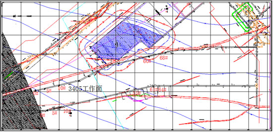 瞬变电磁数据处理:数据处理时建立统一坐标系,以3405工作面运输巷切眼拐点为平面坐标原点,沿工作面走向为x轴正方向,沿工作面倾斜方向为y轴正方向,为每个数据采集点建立坐标,并形成给定的数据格式文件,然后进行联合反演,获得工作面内岩层的电性参数,采用Surfer软件形成电阻率等值线图。