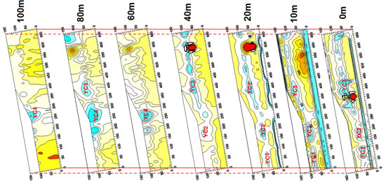 图5为3405工作面联合反演不同深度视电阻率切片图,为了解影响3煤开采含水层的电性特征,把运输巷和材料巷两巷的数据进行联合反演,制作了3煤上100m、3煤上80m、3煤上60m、3煤上40m、3煤上20m、3煤上10m、3煤上0m切片图来了解3煤顶板砂岩含水层、侏罗系砾岩含水层的富水性。对于3煤顶板砂砾岩含水层富水区的划分:以3煤上0m~40m切片为准,视电阻率小于15Ω.m的区域定为强富水区。