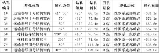 针对瞬变电磁探测成果中提供的4个顶板富水异常区以及现场所施工的钻机窝情况,对每个异常区域施工2个探放水钻孔,钻孔具体布置如下(见表1物探异常区验证钻孔参数一览表):