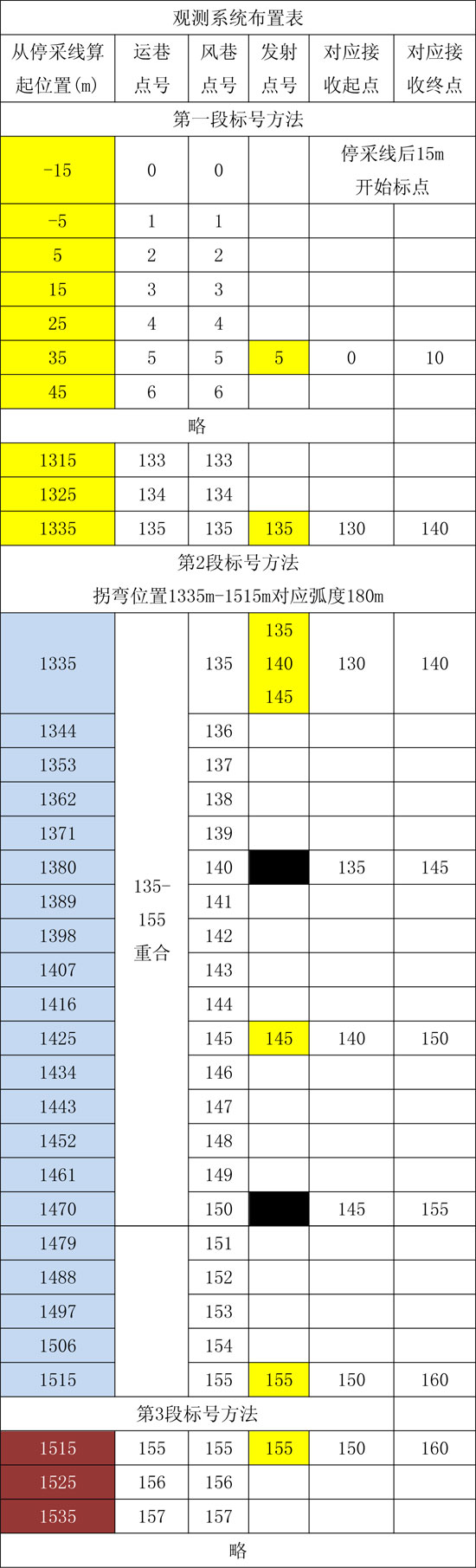 探测方法采用分辨率较高的定点扫描法进行探测。发射机固定于发射点,发射点间距50m,接收机在另一对应巷道前后各50m范围内以10m接收点间距逐点接收其场强值。在工作面转弯位置,运输巷135-155号点重合,按照下表(观测系统布置表)采集表采样数据。