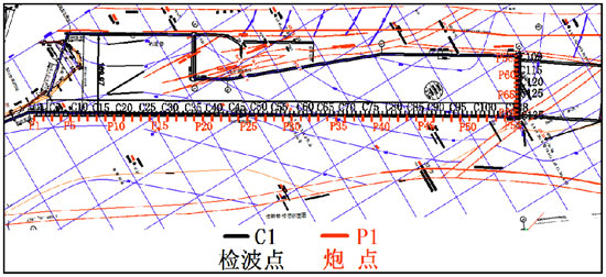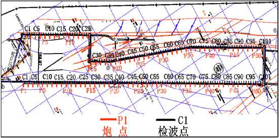 (1)测量标点:据以上所设计的炮点的接收点的位置,由测量人员在运输巷非工作面一侧煤帮进行测量标点,炮点以P1、P2....标记,接收点以C1、C2....标记;标记位置要选择在固定设施上,如管道、钢带等,字体大小和颜色要醒目。