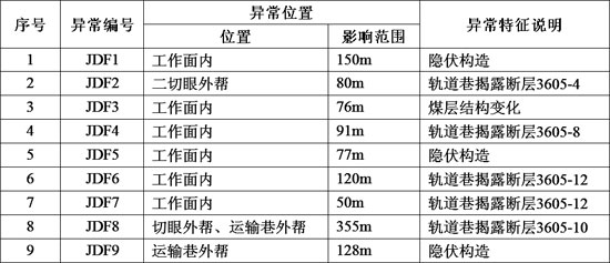 (2)综合槽波探测结果、工作面揭露断层分析,JDF1为面内隐伏构造;JDF2为3605-4断层发育位置;JDF3为工作面内煤层结构变化范围;JDF4为断层3605-8主要发育区段;JDF5为隐伏的断裂构造;JDF6为断层3605-12主要发育区段;JDF7为断层3605-12主要发育区段;JDF8为断层3605-10主要发育区段;JDF9为隐伏的断裂构造。