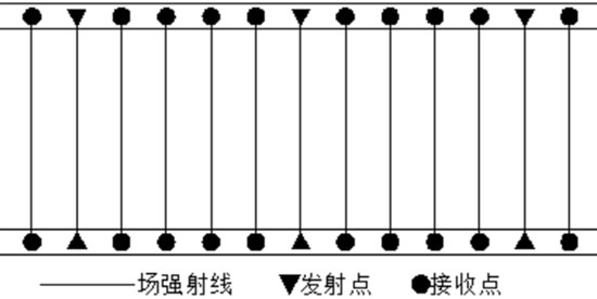 无线电波透视勘探过程中,风道及机道均对应布置测线长度750m,接收点76个,接收点间距10m,发射点14个,发射点间距50m,且发射点均在测线开始的50m位置开始布置,每条巷道个发射点对应另一条巷道11个接收点。